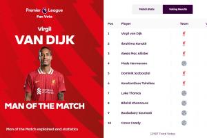 范迪克獲得了51.9%的投票,他本場傳球成功率87.7%??萍{特獲得15.7%的投票排名第二,麥卡利斯特排名第三,他獲得13.3%的投票。