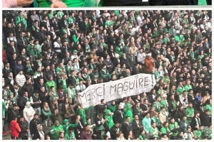 圣埃蒂安球迷在比賽中身穿感謝馬奎爾的球衣,并拉出橫幅,上面寫著“謝謝馬奎爾”,嘲諷同大區(qū)的死敵里昂。