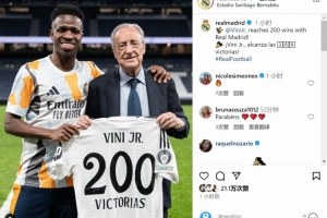 此役是維尼修斯皇馬生涯獲得的第200場勝利,俱樂部主席弗洛倫蒂諾向他頒發(fā)200勝紀(jì)念球衣,皇馬官方社媒曬出兩人的合照,對維尼修斯表示祝賀。