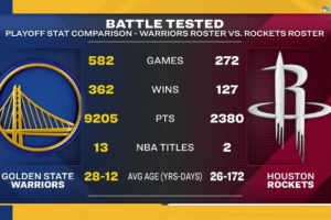 季后賽得分:勇士全隊9205分、火箭全隊2380分