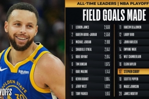 這樣一來,庫里季后賽的運動戰(zhàn)進球數(shù)來到1336個,超越皮蓬升至歷史第17位。