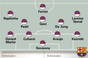 巴薩首發(fā):什琴斯尼;杰拉德-馬丁、庫(kù)巴西、阿勞霍、孔德;佩德里、加維、德容;拉菲尼亞、費(fèi)蘭、亞馬爾