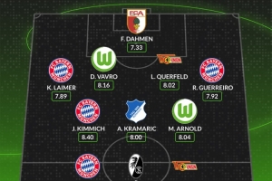 體育資訊4月21日訊 德甲第30輪全部戰(zhàn)罷,數(shù)據(jù)網(wǎng)站W(wǎng)hoscored盤點了本輪比賽評分最高陣容,其中凱恩領(lǐng)銜鋒線、基米希、克拉馬里奇在列,具體如下: