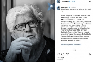 體育資訊4月21日訊 慕尼黑1860俱樂部今日發(fā)布訃告,球隊(duì)前主帥、曾執(zhí)教過遼寧宏運(yùn)的德國籍教練維爾納-洛蘭特因病去世,享年76歲。