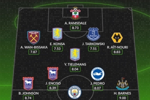 中場:蒂勒曼斯(阿斯頓維拉)、恩西索(伊普斯維奇)、若昂-佩德羅(布萊頓)