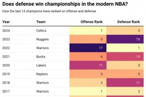 自2011年小牛(獨(dú)行俠)奪冠以來,歷屆冠軍球隊(duì)的進(jìn)攻/防守排名。