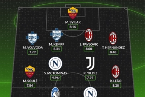 中場(chǎng):蘇萊(羅馬)、麥克托米奈(那不勒斯)、伊爾迪茲(尤文圖斯)、萊奧(AC米蘭)