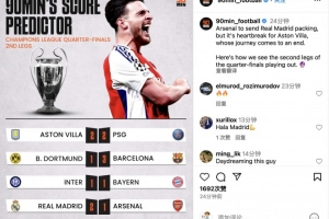 體育資訊4月15日訊 今晚凌晨,歐冠1/4決賽次回合戰(zhàn)火重燃。媒體90min預(yù)測(cè)了這四場(chǎng)比賽的賽果,90min表示阿森納將淘汰皇家馬德里,而阿斯頓維拉本賽季的歐冠征程也將就此終結(jié)。