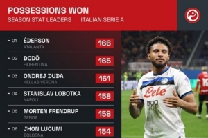 本賽季意甲奪得球權(quán)次數(shù)榜: