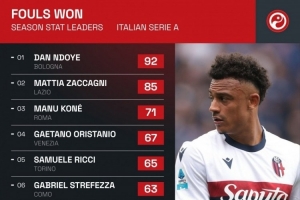 體育資訊4月23日訊 Squawka統(tǒng)計(jì)了意甲球員本賽季聯(lián)賽制造犯規(guī)的次數(shù),并列出榜單,恩多耶92次居首,扎卡尼85次第二。