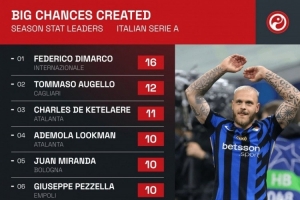 體育資訊4月23日訊 Squawka統(tǒng)計了意甲球員本賽季聯(lián)賽創(chuàng)造重大機會的次數(shù),并列出榜單,迪馬爾科16次居首。