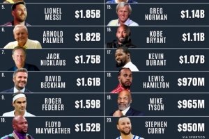 >運動員收入前10:喬丹30億居首&經(jīng)通脹調(diào)整后41.5億詹姆斯排第四。而在名單11-20里,有四位NBA球員分別是" />