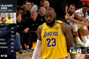 詹姆斯季后賽在場數(shù)、出場時間、得分、投籃命中數(shù)、罰球命中數(shù)、防守籃板、搶斷七項數(shù)據(jù)都高居聯(lián)盟歷史第一。