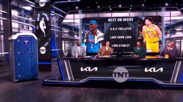 昨天,奧尼爾在節(jié)目中突然憋不住了,離開直播去上廁所。為了防止奧尼爾再度突發(fā)惡疾,TNT今天在直播間放了個移動廁所。