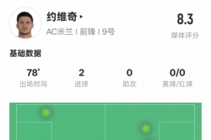 體育資訊4月24日訊 意大利杯半決賽次回合,AC米蘭對(duì)陣國(guó)際米蘭,約維奇首發(fā)出戰(zhàn),2次射門2次射正,打進(jìn)2球,評(píng)分8.3。