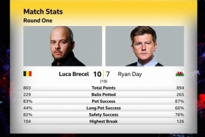 休息歸來(lái)后瑞恩-戴在單局內(nèi)打出單桿62分和64分將比分追平。第十六局,瑞恩-戴關(guān)鍵球母球摔袋。布雷切爾率先拿到賽點(diǎn)。最終盧卡-布雷切爾以10-7戰(zhàn)勝瑞恩-戴晉級(jí)十六強(qiáng),將在1/8決賽對(duì)陣丁俊暉。