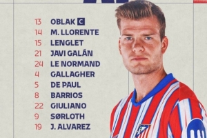 馬競首發(fā):13-奧布拉克、14-馬科斯-略倫特、15-朗格萊、21-加蘭、24-勒諾爾芒、4-加拉格爾、5-德保羅、8-巴里奧斯、22-朱利亞諾-西蒙尼、9-索爾洛特、19-阿爾瓦雷斯