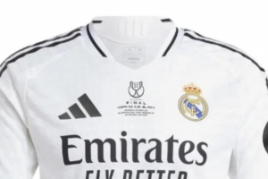 皇馬將在周六對陣巴薩的國王杯決賽中穿上這款特別版球衣,球衣胸前印有國王杯決賽標志,包括比賽日期和對陣雙方隊名:皇家馬德里、巴塞羅那。球衣袖子上也將印有國王杯決賽的徽章。