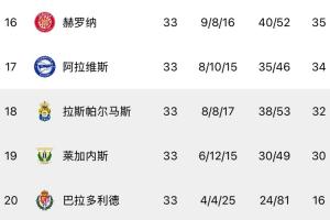 西甲方面,赫羅納本賽季長時(shí)間位居下半?yún)^(qū)。從2月初西甲第23輪開始他們至今已11輪西甲不勝,排名一路從第8狂跌到第16。目前赫羅納33輪35分,只領(lǐng)先降級(jí)區(qū)3分,最后5輪將迎來關(guān)鍵的保級(jí)戰(zhàn)。