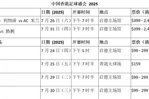「中國香港足球盛會2025」主辦方繼早前公布7月26日利物浦對陣AC米蘭的「渣打杯」及7月31日史上首次海外舉行的北倫敦德比(阿森納對熱刺)后,日前正式公布賽事票價及開售日期。
