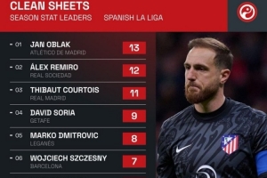 體育資訊4月26日訊 Squawka統(tǒng)計表明,奧布拉克本賽季西甲13次零封,排名第一。