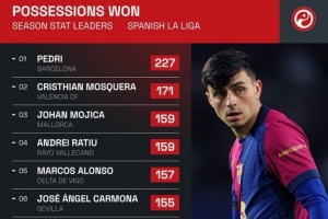 體育資訊4月26日訊 Squawka統(tǒng)計表明,佩德里是本賽季西甲唯一一個搶回球權(quán)200次以上的球員。