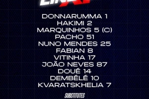 巴黎首發(fā):1-多納魯馬;2-阿什拉夫、5-馬爾基尼奧斯、51-帕喬、25-門(mén)德斯;8-法比安、17-維蒂尼亞、87-若昂-內(nèi)維斯、14-杜埃、10-登貝萊、7-克瓦拉茨赫利亞