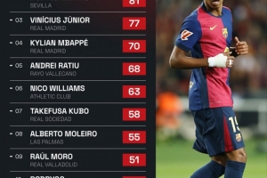 體育資訊4月26日訊 數(shù)據(jù)機(jī)構(gòu)Squawka統(tǒng)計(jì)了西甲本賽季至今完成過(guò)人次數(shù)的排行榜,亞馬爾131次完成過(guò)人斷層領(lǐng)跑西甲!