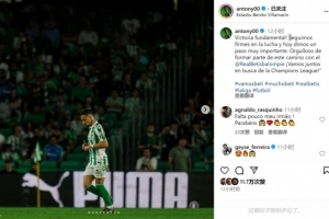 安東尼社媒曬出自己的賽場照片,配文:“一場關(guān)鍵的勝利,我們在競爭中繼續(xù)穩(wěn)步前進(jìn),今天邁出了非常重要的一步。很驕傲在貝蒂斯參與這段征程,讓我們一起為歐冠資格而戰(zhàn)!”