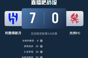 體育資訊04月26日訊 亞冠精英聯(lián)賽1/4決賽,利雅得新月7-0橫掃光州FC晉級四強。