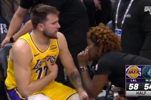 半場(chǎng)休息時(shí),胃部不舒服的東契奇回到替補(bǔ)席與隊(duì)醫(yī)交流。