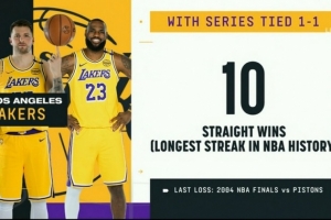 賽前轉(zhuǎn)播方給出紀(jì)錄,湖人系列賽1-1后G3已經(jīng)10連勝,今日紀(jì)錄終結(jié)。