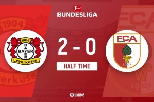 上半場補時3分鐘,勒沃庫森2-0奧格斯堡。