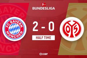 半場(chǎng)戰(zhàn)罷,拜仁暫2-0美因茨。