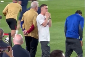 體育資訊4月27日訊 在國王杯決賽前,現(xiàn)場播放了皇馬的隊歌,因傷無法出場的巴薩球員卡薩多在場邊送上了噓聲。