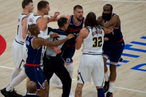 不過最終哈登、鮑威爾、鄧恩、約基奇、戈登、布勞恩六人吃T,兩隊各三個,直接抵消了,無事發(fā)生。
