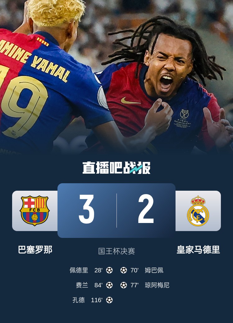 體育資訊4月27日訊 在國(guó)王杯決賽,巴薩經(jīng)歷加時(shí)3-2擊敗皇馬。